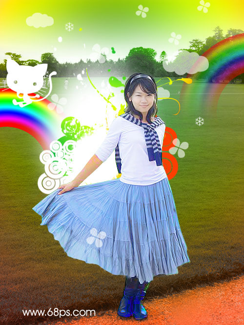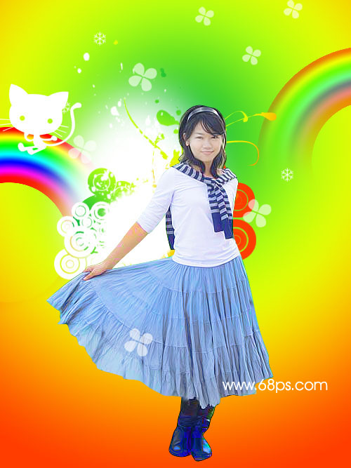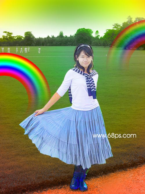 7.把彩虹拖到剛才的人物圖片中,用橡皮工具適當的把不要的部分擦除,把人物圖片顯示出來效果如圖10,右邊的彩虹的透明度為:50%.