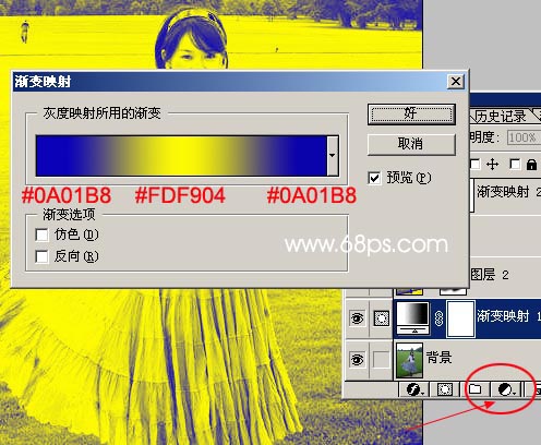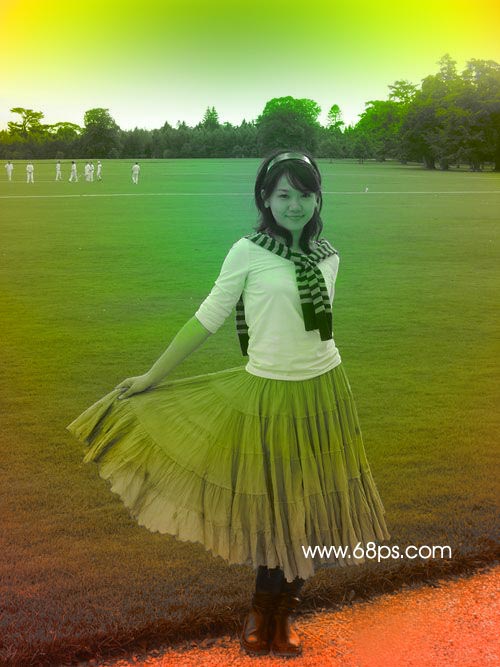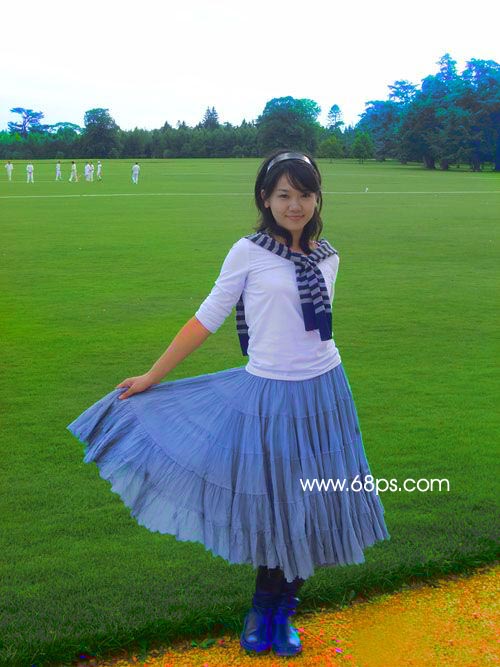 1.打開原圖,按下圖箭頭的地方創建調整圖層選擇“漸變映射”,顏色設置如下圖中,確定后把圖層混合模式改為"飽和度",再用黑色羽化畫筆工具把草地及人物部分擦出來,鞋子部分不用擦效果如圖2