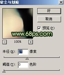 6.新建一個圖層按ctrl + shift + alt + e,蓋印圖層,然后執行菜單:濾鏡 > 雜色 > 蒙塵與劃痕,參數設置如圖9,確定后再把圖層混合模式改為“ 疊加”,圖層不透明度改為:50%,效果如圖10。