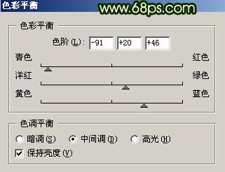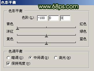 1.打開原圖按ctrl + j 復制一層,按ctrl + b 調色彩平衡參數設置如圖1,確定后把圖層混合模式改為“強光”,效果如圖2