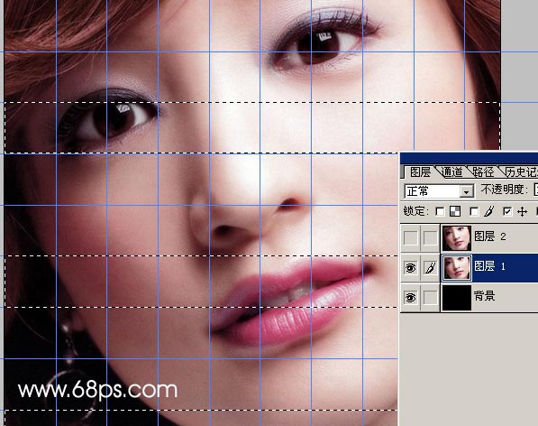 回到圖層1現在開始制作橫向的線條用矩形選框工具按照橫向參照線繪制圖3所示的選區。方法:繪制一條以后按住"shift"就可以畫第二條了。