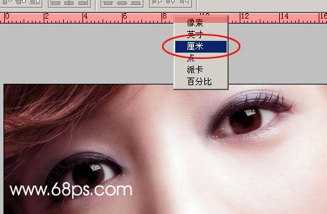 1.打開原圖按ctrl + r調出標尺如下圖在標尺的位置按鼠標右鍵就可以選擇單位了,然后選擇厘米。也可以自己定義!