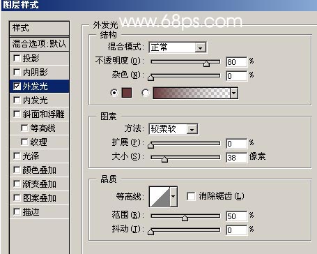 9.回到圖層3,雙擊圖層調出圖層樣式選擇外發光,參數設置如圖11,確定后按ctrl + alt + g與前一圖層編組,這樣做的好處是本層的圖層樣式只能對前一圖層有效,也就是我們現在用了外發光只能在他下面圖層有東西的地方才能顯示,如果有地方被刪除了就顯示不了!如圖12