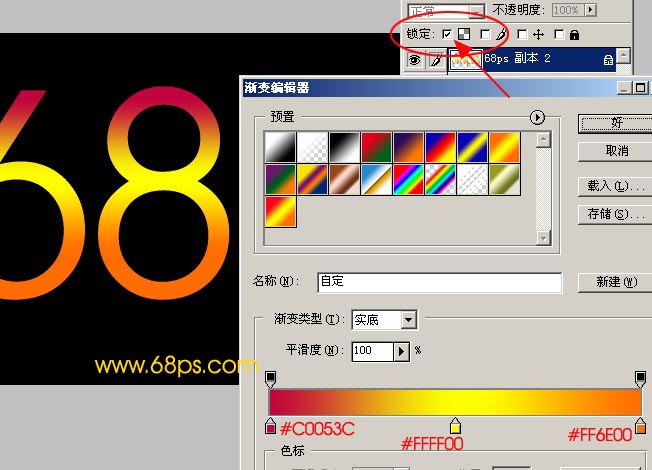 2.把文字圖層刪格化圖層,然后鎖定如圖2箭頭頭的地方勾選,使用漸變工具顏色設置如下圖,繪制由上到下的線性漸變。