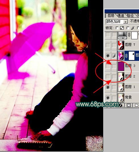 4.新建一個圖層按ctrl + shift + alt + e蓋印圖層然后把圖層混合模式改為“顏色加深”,加上圖層蒙版把人物的臉部擦出來,再把圖層2和圖層3隱藏如圖5所示。效果如圖6