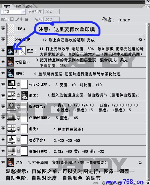 本教程介紹冷艷色調照片的制作教程,主要是通過調色相/飽和度、對比度,可選顏色等來調出藍色的基調,然后再通過圖層模式的混合來加大圖片的對比。最后再加上光照效果來聚光,讓照片的主體更突出。制作的步驟有點復雜,作者只提供了部分參照圖層文字,大部分內容還需要大家邊制作邊領悟!