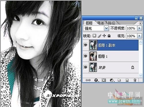 步驟4 回到圖層1副本 把小眼睛打開 選擇 強光photoshop,