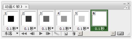 之前我們制作的是位移動畫,是利用圖層的移動。除此之外,還可以通過設定不同的圖層部透明度來產生動畫,制作的方法相信大家應該可以猜得到,那就是在不同的幀中改變圖層調板中的部透明度數值。現在新建一個100×100的圖像,新建一個圖層并繪制一個方塊。然后一次性復制5個幀出來,將會看到6個幀都是相同的內容。將所有幀的停留時間統一改為0.1秒,如下左圖所示。