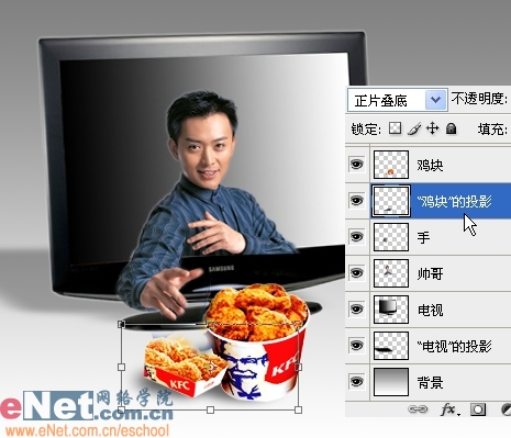 17、用移動工具將雞塊拖入電視文件中,放在帥哥手爪前面。