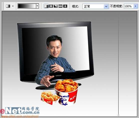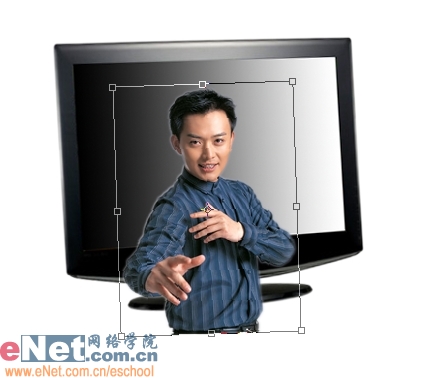 10、用移動工具將帥哥拖入電視文件中,ctrl+t調整到如下大小和位置。