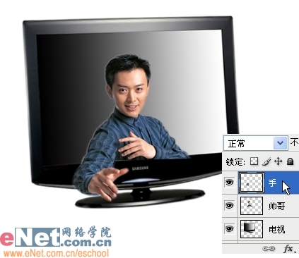 12、選擇“帥哥”圖層,用多邊形套索工具選出帥哥超出電視的部分,delete鍵刪除。