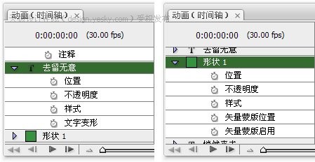 在時間軸中我們看到了類似圖層調板中的圖層名字,其高低位置也與圖層調板相同。點擊圖層左方的箭頭標志就會展開該圖層所有的動畫項目,也就是能制作為動畫的要素。在不同性質的圖層中,其動畫項目也不相同。所謂不同性質就是指如普通圖層、帶蒙版的普通圖層、文字圖層、調整圖層等,這些都屬于不同性質的圖層。如下左圖所示分別是“去留無意”文字層與“形狀1”矢量形狀層展開后的動畫項目。其共有的是位置、不透明度、樣式。不同的是文字層多了一個“文字變形”項目,而矢量形狀層多了兩個與蒙版有關的項目。