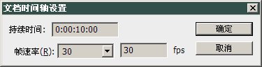 按鈕后選擇“文檔設定”,就會出現如下右圖所示的時間軸設定。在其中可以指定動畫總時長和幀速率。按照默認的設置,是總長10秒,每秒30幀,這樣總幀數就是300幀,對于網頁動畫來說這是一個相當大的數值了,制作出來會占用很大的字節數,不利于網絡的傳輸?,F在我們將持續時間改為5秒,幀速率改為5fps。確認后就會在動畫調板中看到新的幀速率指示。