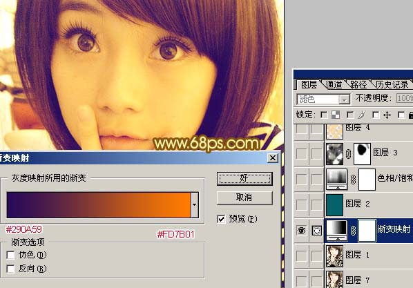 2.創建調整圖層選擇漸變映射,參數設置如圖3,確定后把圖層混合模式改為“濾色”,效果如圖4