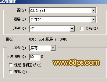 1.打開原圖按ctrl + j復制一層,執行菜單:圖像 > 應用圖像 參數設置如圖1(屏幕在其它的版本為濾色),效果如圖2