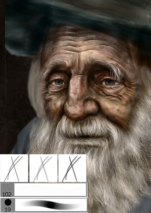 技術(shù)點(diǎn)自定義一個(gè)雜點(diǎn)分布的自定義筆刷和photoshop里的筆刷的選項(xiàng)來(lái)繪制胡須和毛發(fā)這里一定要反復(fù)實(shí)踐。