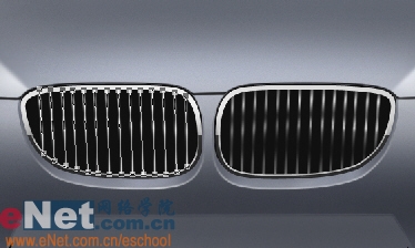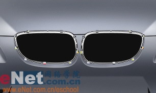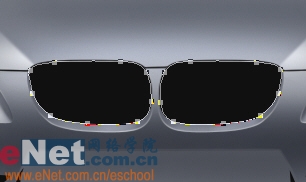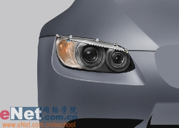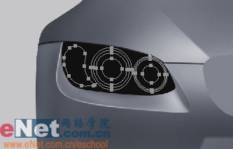 7.新建圖層,將勾好的路徑填充黑色,然后在將燈外圍的路徑轉為選區用加深減淡工具根據光照的方向進行涂抹,然后將路徑描一個細小的白邊,調整亮度,擦除多余的部分,做出高光的效果,將車燈復制一份到右邊,并適當修改一下。