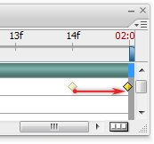 此時(shí)循環(huán)效果已形成,只是在開始時(shí)刻和結(jié)束時(shí)刻存在相同狀態(tài)的幀。由于這里不是對(duì)稱的往復(fù)式動(dòng)畫,可直接將結(jié)束時(shí)刻(01:14)的關(guān)鍵幀移動(dòng)到02:00處,如下圖所示。如果掌握了之前所學(xué)的內(nèi)容就能理解02:00時(shí)刻實(shí)際上并不屬于動(dòng)畫過程,真正的動(dòng)畫過程是00:00至01:14。