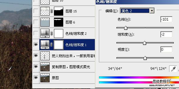 4.草的顏色也配合上,一樣的調(diào)出色相/飽和度。然后選擇綠色點(diǎn)草,把色相往左拉,得到草變得發(fā)紅也是配合葉子。