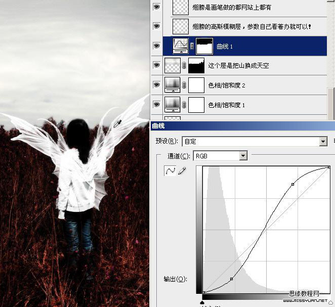 6.接下來到了最主要的人物了,也是總體的渲染,因?yàn)橐鯽ngle的感覺,我印象里angle肯定要發(fā)光的上面也提過,發(fā)光我是用新建一個(gè)層用一個(gè)橢圓選取框,做250的最大羽化,然后再新建一個(gè)層做任務(wù)表面的集中發(fā)光,這樣做的話會(huì)造成一片白,圖片也沒有層次,所以我們事前把圖片搞暗,然后把圖片整體做得明暗分明,天空的素材已經(jīng)很暗了所以這里我們把天空用蒙版排除。