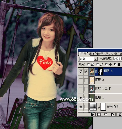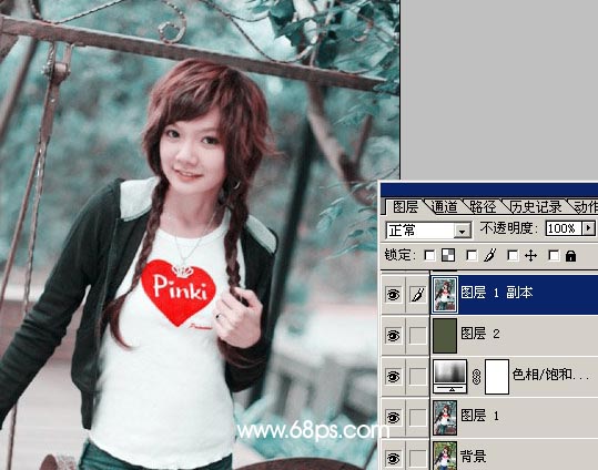 1.打開原圖按ctrl + j復制一層,點通道面版選擇綠色通道按ctrl + a全選,按ctrl + c復制,點藍色通道按ctrl + v粘貼,回到圖層棉版效果如圖1