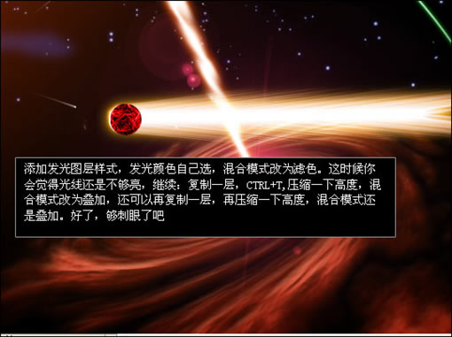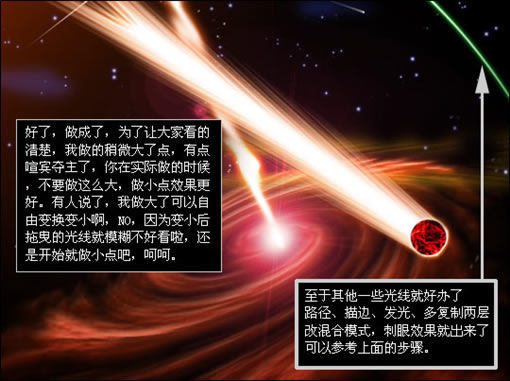 至于其他一些光線就好辦了,路徑、描邊、發光、多復制兩層改混合模式,刺眼效果就出來了,可以參考上面的步驟。