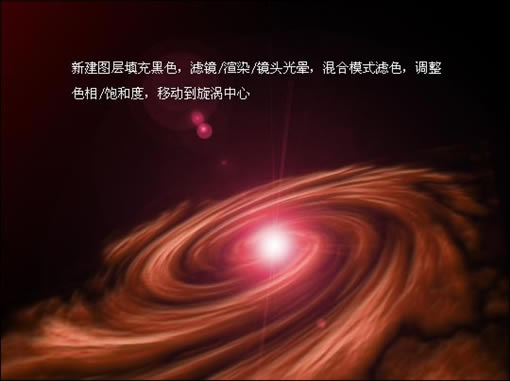 新建圖層填充黑色,濾鏡/渲染/鏡頭光暈,混合模式濾色,調整色相/飽和度,移動到旋渦中心