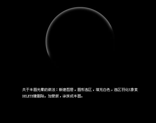 關于半圓光暈的做法:新建圖層,圓形選區,填充白色,選區羽化5像素,delete鍵刪除,加蒙版,涂抹成半圓。
