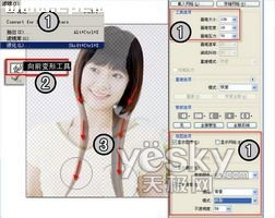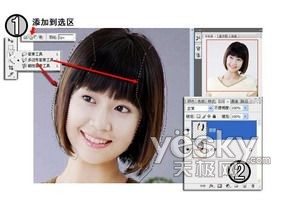 1.首先在工具箱中選擇套索工具(如圖1步驟1),對女孩兩邊的頭發大致作一個選擇,我們有三種套索工具可以使用,它們是“手控套索”、 “多邊形套索”和“磁性套索”。手控套索工具可以用來選取無規則形狀的圖形,多邊套索工具可以用來選取無規則的多邊形圖形,這里我們用多邊套索來做出不規則的多邊形形狀(如圖1),它還可以用于選取一些復雜的、棱角分明的、邊緣呈直線的圖形。而磁性套索工具則可以用來選取無規則的但與背景反差大的圖形。