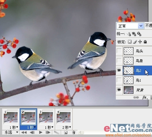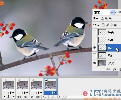 16、選擇第2幀,隱藏其它圖層,只顯示鳥2和背景