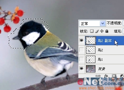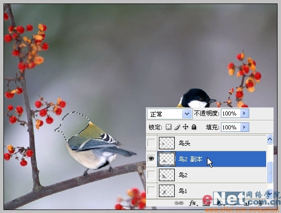 11、在圖層面板按住ctrl鍵單擊“鳥頭”層以載入其選區,選擇“鳥2副本”層,按delete鍵刪除后將圖層名稱改為“鳥身”。