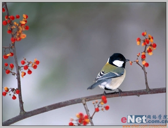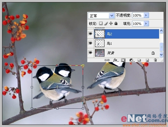 5、ctrl+j復制小鳥為單獨的圖層,用移動工具將它拖到樹枝的另一邊,ctrl+t調整到合適的角度。現在我們就有了兩只并排站立的小鳥。