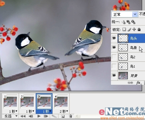 17、選擇第3幀,只顯示鳥頭、鳥身和背景。