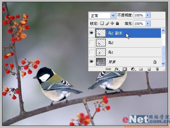 8、調整好“鳥2”的角度后再次ctrl+j復制出“鳥2副本”,然后隱藏“鳥1”和“鳥2”層,去掉圖層前面的小眼睛圖標即可隱藏。