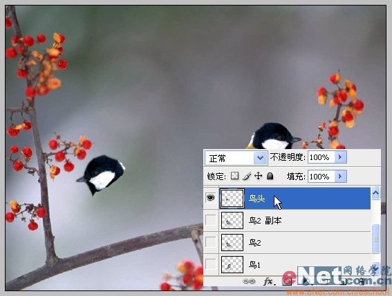 10、ctrl+j復制出小鳥的頭,命名“鳥頭”,下圖隱藏其它圖層以便于觀看。