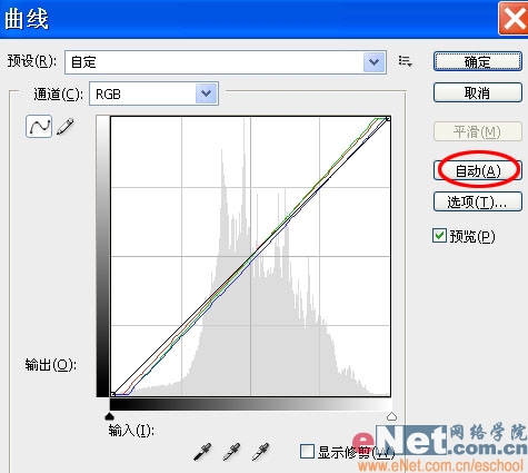 2、ctrl+m調出曲線調節窗口,點擊紅圈內“自動”按鈕修正一下圖片色彩。