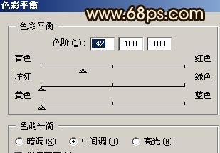 2.按ctrl + b調色彩平衡參數設置如圖2效果如圖3