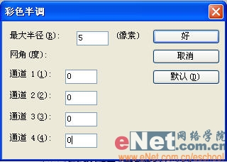 4、選擇菜單欄中的“濾鏡”“像素化”“色彩半調(diào)”命令,在彈出的“色彩半調(diào)”對話框,將“最大半徑”選項設(shè)置為4,“通道”選項均設(shè)為0,如圖05所示,單擊好按鈕,效果如圖06所示。
