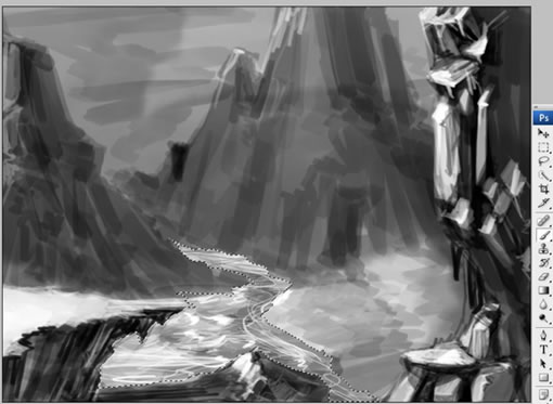 2、確定了大體布局,同種畫筆繼續深入。增強光影效果。用套索工具選擇出水面的部分,然后用圓頭畫筆不段調整直徑進行水面的刻畫。利用選區可以將繪畫的效率提高很多,漫漫常識就會找到竅門。