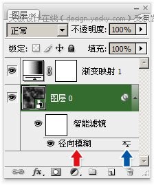 3、通過【圖層>智能對象>轉(zhuǎn)換為智能對象】或直接在圖層調(diào)板中該圖層上點(diǎn)擊右鍵后選擇“轉(zhuǎn)換為智能對象”。再對其使用【濾鏡>模糊>徑向模糊】,效果大致如下左圖所示。此時(shí)的圖層調(diào)板大致如下右圖所示,點(diǎn)擊紅色箭頭處的濾鏡名稱可調(diào)整濾鏡參數(shù),點(diǎn)擊藍(lán)色箭頭處的