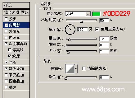 3.新建一個空白圖層,然后把加上樣式的圖層跟空白圖層合并,再雙擊合并后的圖層,調出圖層樣式,參數設置如圖6-11,效果如圖12