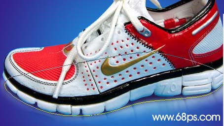 5.擦好以后新建一個圖層(圖層位置在鞋與倒影層之間),用鋼筆工具勾圖7所示的路徑,按ctrl + enter轉為選區按ctrl + shift + d羽化數值為6,填充顏色:#070e5e,大致效果如圖8。這一步是簡單制作鞋子的陰影。