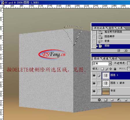 12.在背景圖層上新建圖層2,用多邊形套索工具直接畫出如下圖的四邊形,填充黑色做陰影,然后再調節陰影的透明度并適當哪個柔化原端邊緣,完成最終效果。