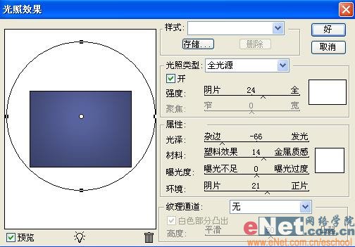 17、執(zhí)行菜單欄中的“濾鏡”“渲染”“光照效果”命令,設(shè)置參數(shù)如圖20所示,圖像效果如圖21所示。