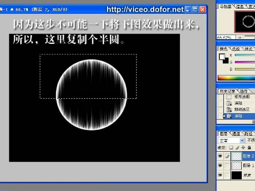 3.選擇矩形選框工具,框選圓的上半部分,按ctrl + c復制,不要取消選區按ctrl + shift + i反選,按delete刪除,確定后再按ctrl + v粘貼,然后把粘貼后的圖形執行菜單:編輯 > 變換 > 垂直翻轉,然后把兩個半圓銜接在一起并合并這兩個圖層。下國如下圖
