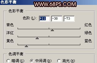 1.打開原圖,創建色彩平衡調整圖層,參數設置如圖1,效果如圖2
