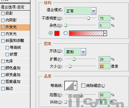 把前面的圖層合拼,然后再添加外發光效果,參數設置如下: