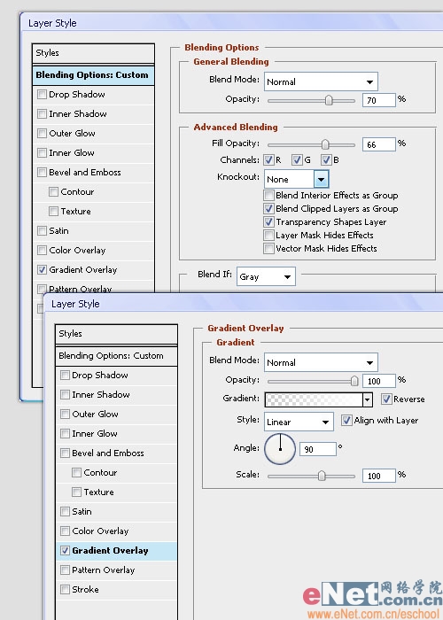 5.接下來,復制最頂層并把得到的復制層移動到3d形狀層和最頂層之間,然后同時按下下,右2個方向鍵2次。移動完以后雙擊此圖層加入漸變疊加圖層樣式如下所示: