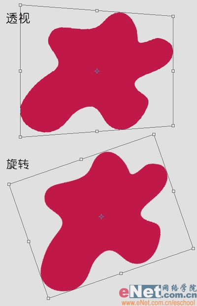 3.下面,用透視變換工具(編輯-變換-透視)將形狀向右邊拉伸一些。然后,在用變換工具(編輯-自由變換)將形狀向左旋轉大約15度。