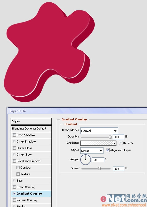 12.下面加入最后的一個步驟,改變原始形狀層和3d層的顏色,分別雙擊以上2個圖層加入漸變疊加圖層樣式。